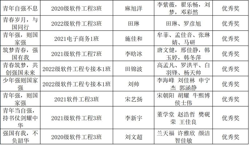 因此,软件学院第三届专业技能大赛赛项之一网页设计大赛,以“青年强,则国家强”为主题开展,突出新时代青少要做中国特色社会主义的建设者和接班人。本次大赛共收到参赛作品92份,6月2日,软件工程系主任组织评委进行评选,经过5位评委的严格评选,从中选出一二三等奖作品6份,分别如下: