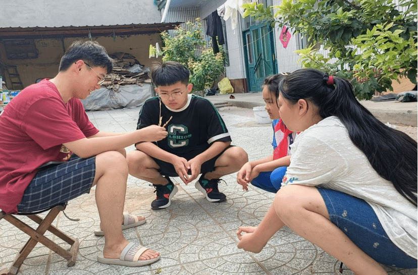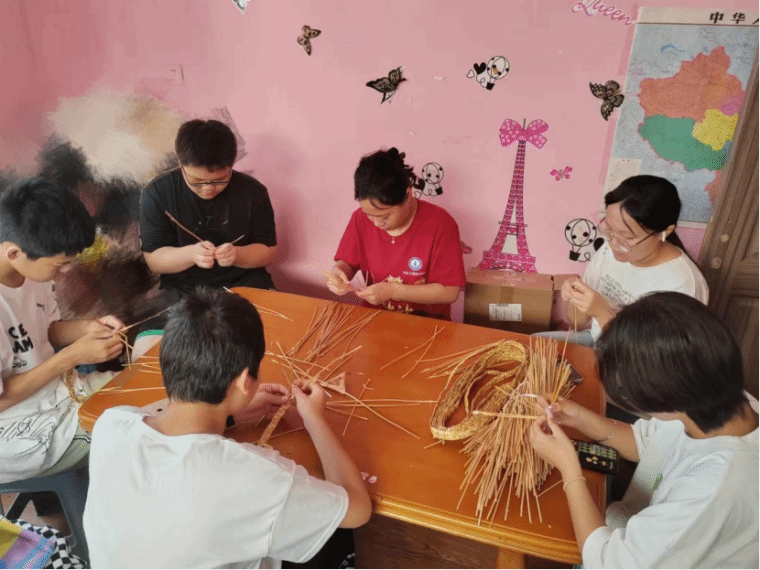 团队成员在自己家乡的兴趣班向中小学生宣传非遗文化,讲解了大名草编的历史、工艺特点及编织技巧,大家通过学到的技法最终编织出了有模有样的花纹。同时团队成员走进家乡村民的家里,向一些对非物质文化遗产感兴趣的中小学生分享了自己在事实践中的所见所闻,用通俗易懂的话回答了大家对非遗的一些疑问,“非物质文化遗产包括大家长时间以来口头传授,民俗的一些活动和礼仪,还有像一些节日,传统手工艺等等,而草编就属于传统手工艺。”团队成员这样介绍道。通过这次宣讲,可以看出来大家其实很愿意了解学习草编,他们在这之中学到了简单的草编编织技法,对非遗文化有了详细的了解。团队成员鼓励他们到学校以后可以讲给自己的同学们,做传播非遗文化的践行者。