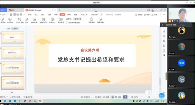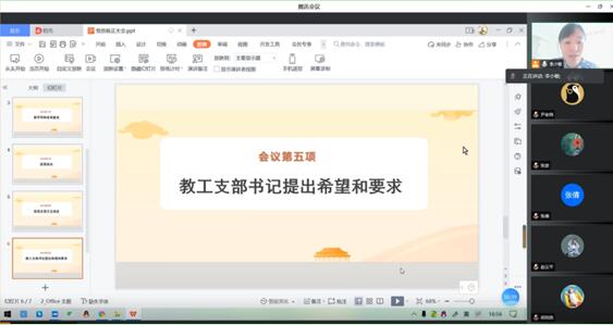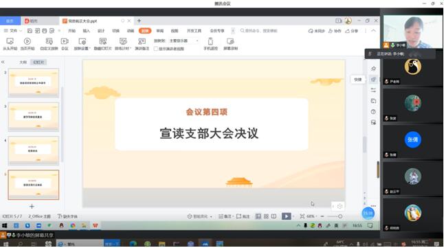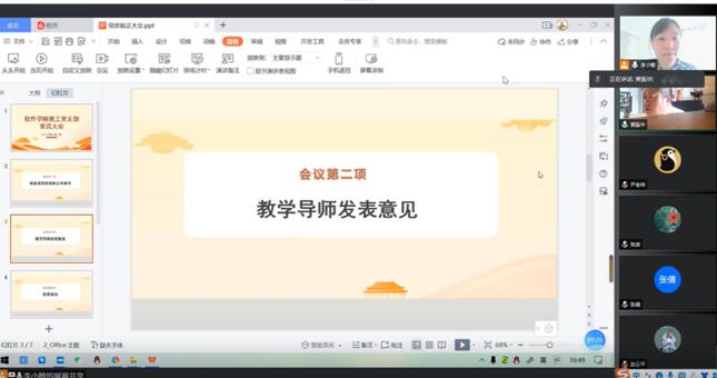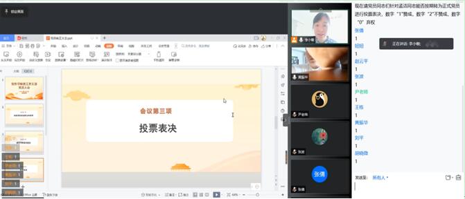 2022年5月3日下午4点30分,软件学院教工党支部在腾讯会议召开线上预备党员的转正大会。参加此次会议的有:软件学院党总支书记王亚杰、教工党支部书记李小敏,宣传委员胡晓微,组织委员赵晓辉等18名党员同志。