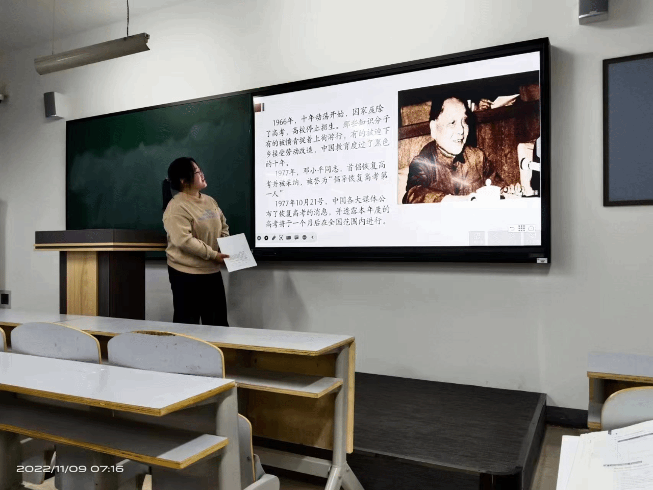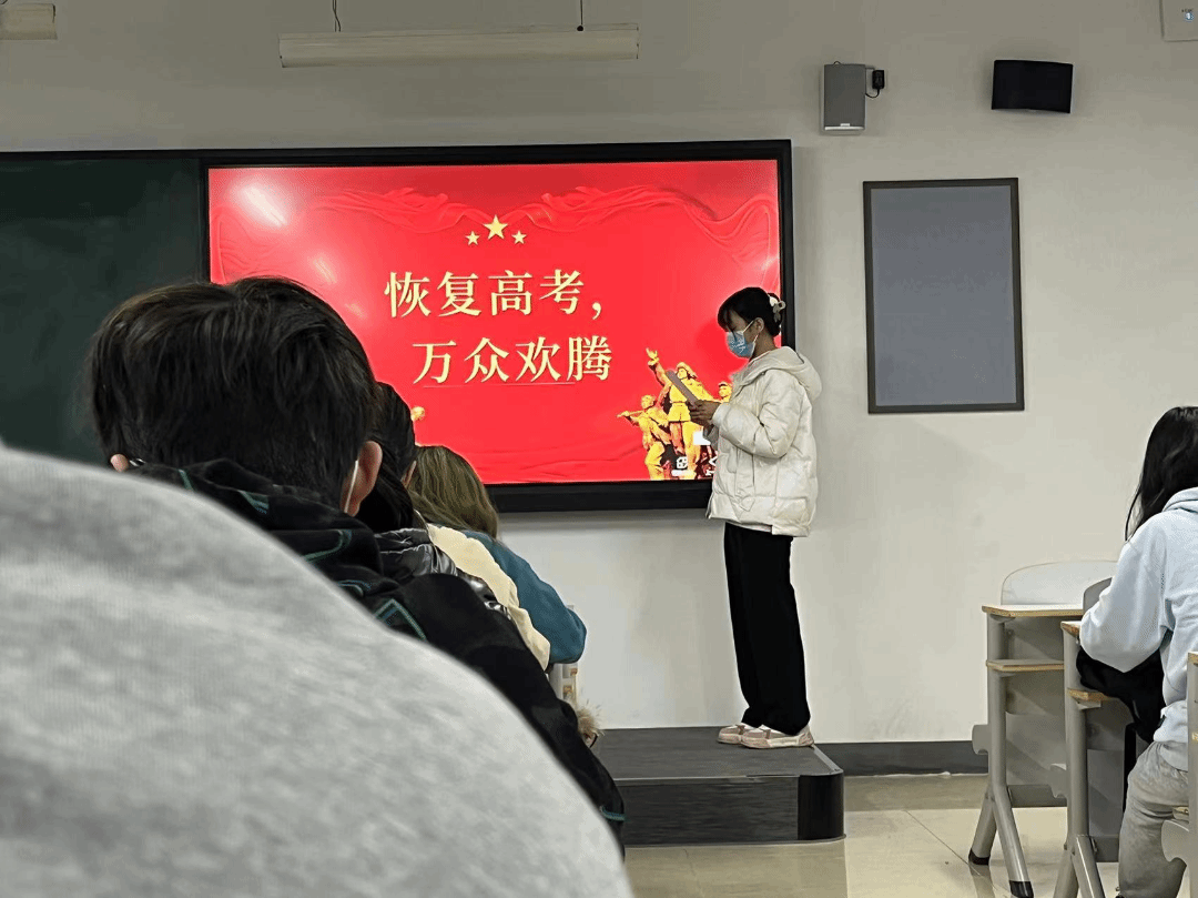 电商2班杨韦凡同学着重介绍了恢复高考后的社会风气。一代有理想、有抱负、渴望知识的中青年人怀着无比激动的心情拿起课本,社会上重新出现了学习科学文化知识的热潮。1977年冬天,全国570万考生走进考场,不久后,27.3万名新生踏入大学校园。高考制度的恢复,为大批知识青年敞开了大学之门,提供了通过考试、靠自己努力和公平竞争获得接受高等教育的机会。自此,“尊重知识,尊重人才”的时代新风让中国焕然一新,国家现代化建设所需要的大批人才开始得到有计划的培养。