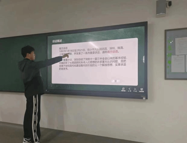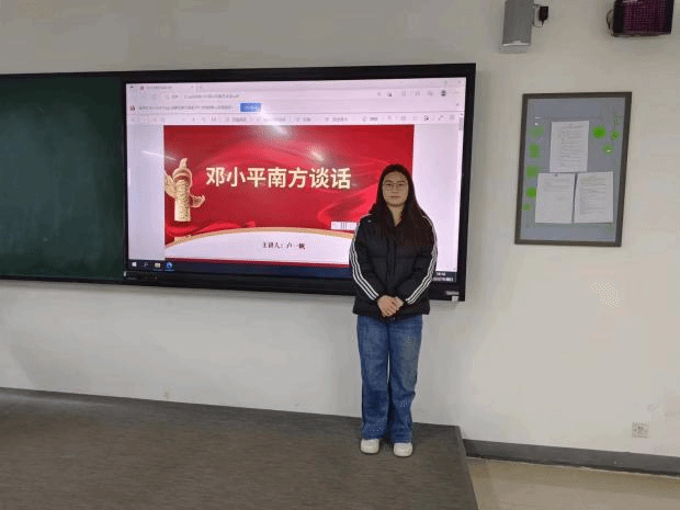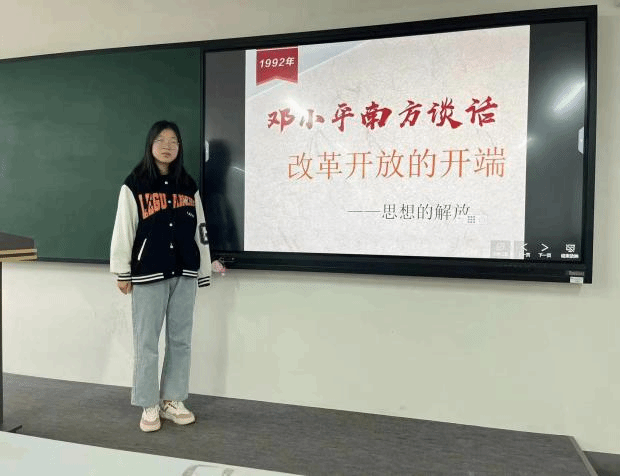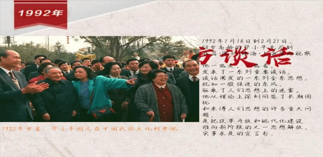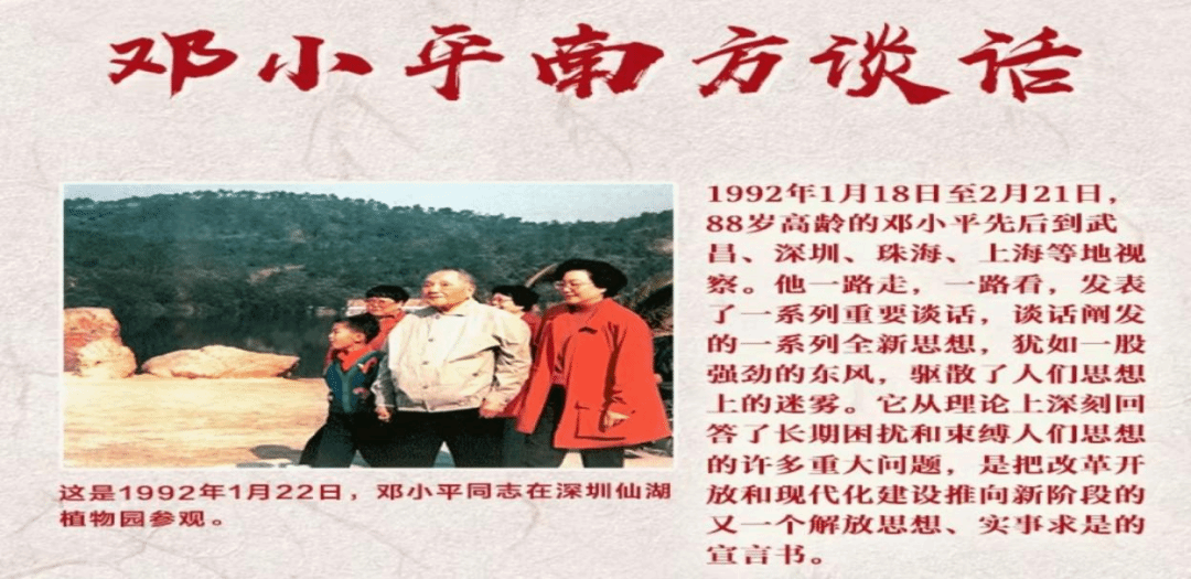 1992年1月18日,当时已正式告别中央领导岗位的党的第二代领导核心、改革开放的总设计师邓小平,以普通党员的身份,凭着对党和人民伟大事业的深切期待,先后赴武昌、深圳、珠海和上海视察,沿途发表了重要谈话。3月26日,《深圳特区报》率先发表了“东方风来满眼春——邓小平同志在深圳纪实”的重大社论报道,并集中阐述了邓小平南方谈话的要点内容。2022年11月10日,同学们通过上网查阅资料、校图书馆查阅文献等方式搜集资料,就“邓小平南方谈话”发表演讲。