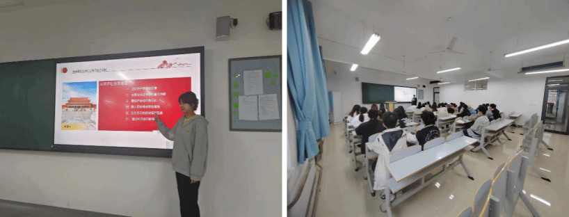 2022级电子商务二班的李梦冉同学首先为同学们介绍到习近平总书记在党史学习教育大会上号召全党同志要做到学史明理、学史增信、学史崇德、学史力行。只有坚持和发展中国特色社会主义,才能实现“两个一百年”奋斗目标。中国特色社会主义是连续性和阶段性的统一,马克思主义认为,人类社会是一个不断地从低级向高级发展的历史过程,这个过程是由无数不同的相互连接的发展阶段组成的。