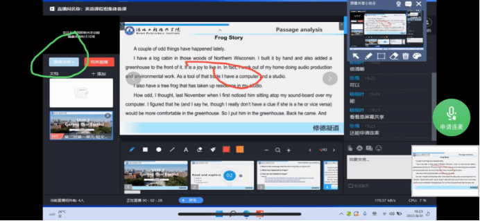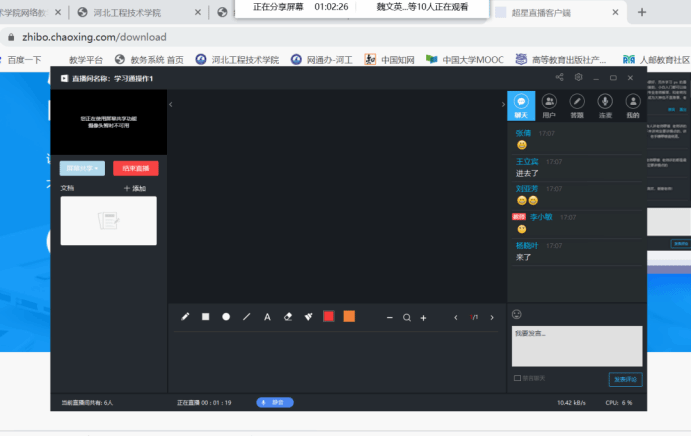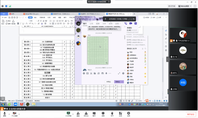 各教研组、备课组云端相聚。主要讨论以下内容:研讨教学大纲(课时分配、教学内容、教学重难点、实验内容、考核形式以及考核比例等);确定教学资料编写要求(保持一致,以及日历、首页、续页具体书写、PPT自行编写);教学平台的利用(超星平台中教学资源的建设)。