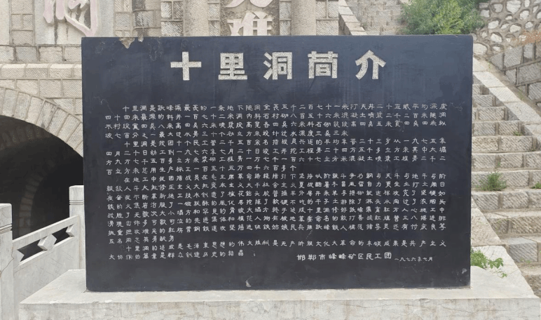 磁县跃峰渠十里洞位于河北省邢台市磁县境内,是一处自然景观和人文景观相结合的旅游胜地。这里的“十里洞”是指一条长约10公里的峡谷,洞内有多个洞穴和瀑布,景色壮观。十里洞地质复杂,岩层多变。有坚硬如铁的火焦岩,有软硬相间的鹅卵层,有见风就酥的风化土,每掘进一米,都有说不完的困难。十里洞位于磁县白土镇,进洞口在上寨村东南,出洞口在白土村东北,全长5186米,故起名为十里洞,开凿宽度为6米,高度为5.6米,断面为马蹄型,流量为30立方米/秒,是1975年至1976年“邯郸地区山区建设指挥部峰峰矿区民工团”修建的,团部在白土村三大队,施工不到两年时间,修渠民工从2500人逐步增加到5000人。