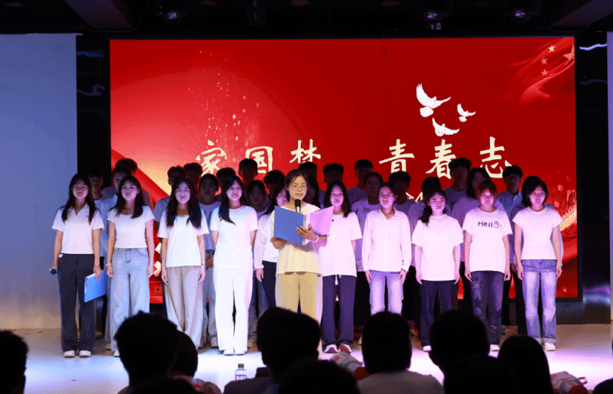 当经典与潮流碰撞,舞台成为文化传承的创新场域:2024级空间信息与数字技术3班团支部以“温情—俏皮—热烈”三重奏点燃气氛——《在你的身边》合唱如春日微风,《呲牙舞》灵动似精灵跃动,《最炫民族风》热舞掀起全场大合唱,传统民歌与现代街舞的混搭掀起狂欢;2024级网络空间安全2班团支部《星火燎原—从井冈山到中国梦》则以革命旧址沙画为背景,舞者以红绸为“火炬”,在《十送红军》旋律中演绎长征征程,朗诵声中“中国梦”主题沙画渐次展开,历史厚重感与时代使命感浑然一体;2024级空间信息与数字技术2班团支部《我的未来式》采用分组轮唱与和声交织形式,同学们以青春宣言为内容,加上配乐诗朗诵《青春中国》,朗诵者们以饱含深情的声音,回溯了中国从近代的沧桑屈辱走向如今的繁荣昌盛的艰辛历程,展现了青年的担当。