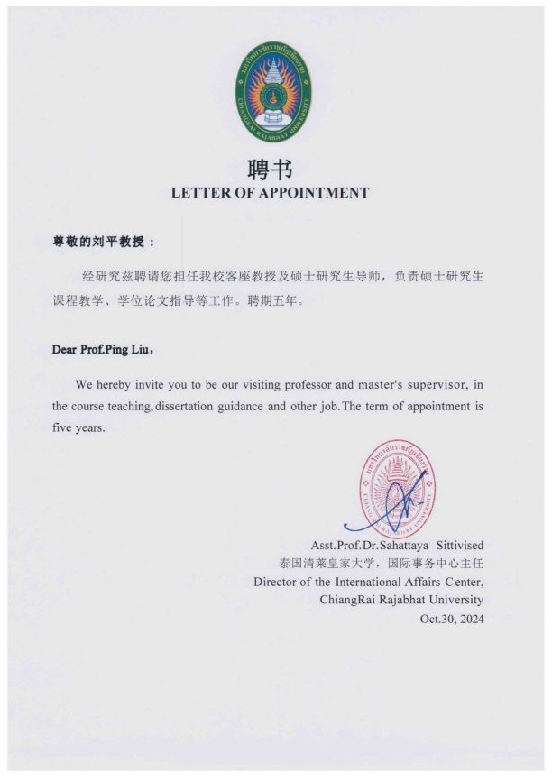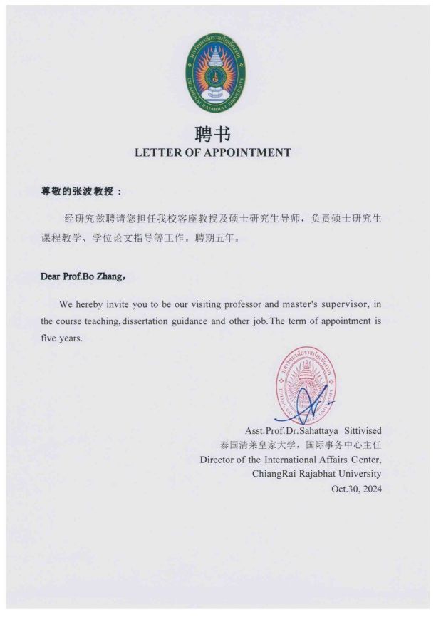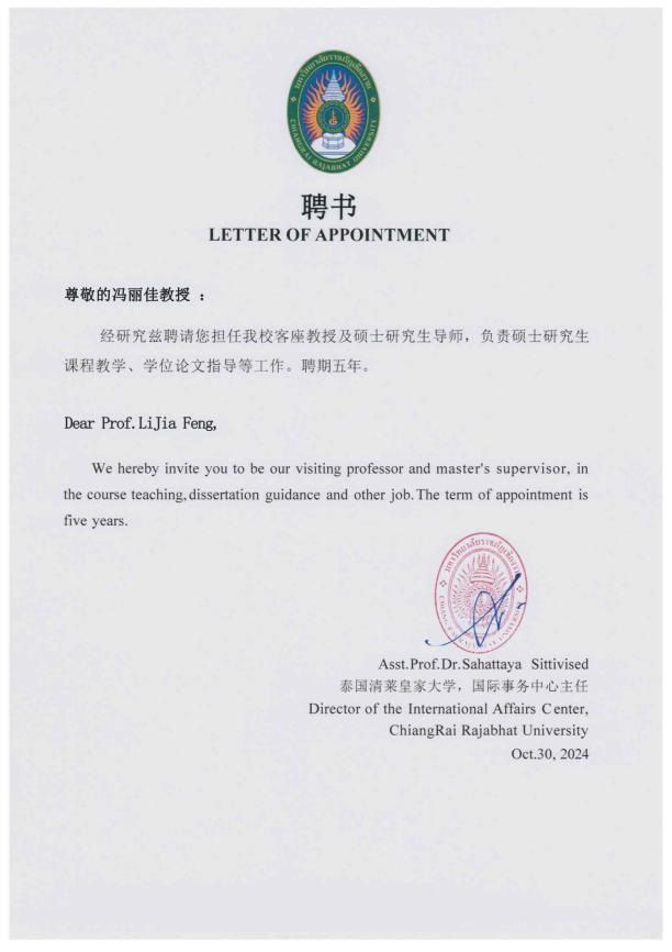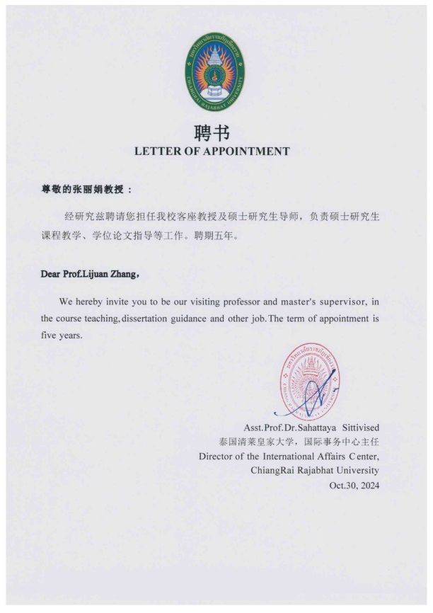 为积极响应国家共建“一带一路”教育行动的号召,深化我校国际交流与合作的战略部署,推动高水平教育对外开放,我校与泰国清莱皇家大学共同设立“硕士研究生联合培养中心”。经教师个人申请、各教学单位初审、校领导复审、泰国清莱皇家大学评议,2024年10月30日起,我院张波、冯丽佳、张丽娟、刘平4名教师被聘任泰国清莱皇家大学硕士研究生导师,聘期五年。