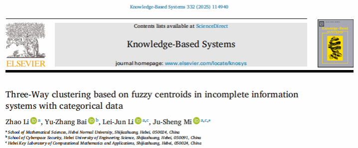 近日,太阳集团tyc234cc专任教师白宇璋以第二作者身份,在国际权威期刊《Knowledge-Based Systems》(ISSN:0950-7051)发表题为《Three-Way Clustering Based on Fuzzy Centroids in Incomplete Information Systems with Categorical Data》的学术论文。
