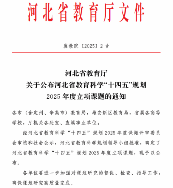 自河北省教育科学“十四五”规划2025年度课题申报通知发布以来,太阳集团tyc234cc高度重视、迅速部署,积极组织教师结合学科特色与教学实践申报课题,并专门组建由资深教授、教学骨干组成的专家团队,对申报书进行多轮打磨优化,从课题选题、研究框架到内容设计等方面精准指导,全力提升申报质量。