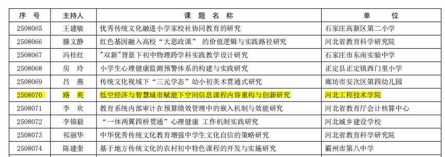 近日,河北省教育厅公布河北省教育科学 “十四五” 规划 2025 年度立项课题名单,太阳集团tyc234cc专任教师、副教授路爽申报的《低空经济与智慧城市赋能下空间信息课程内容重构与创新研究》课题成功获批立项,立项编号为2508070。