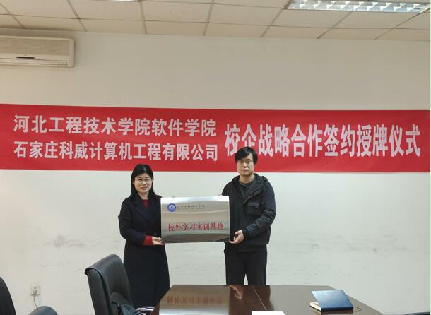2022年3月9日下午,软件学院与石家庄科威计算机工程有限公司举行校企战略合作授牌仪式,将该公司作为我院软件工程专业学生校外实习实训基地。。出席授牌仪式的领导软件学院院长赵冬梅、教学副院长刘翠焕等,石家庄科威计算机工程有限公司总经理吕光宾、技术总监郭晓光等。