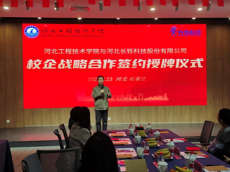 校企合作双方首先共同观看了企业宣传片,副校长辛彦怀代表学校致辞。他介绍了我校的发展历程与十四五规划,对企业方的信任和支持及表示真诚感谢;他强调,加强产教融合、校企合作对学校提高人才培养质量非常重要。