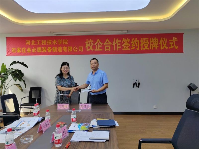 随后,TYC234CC太阳成集团软件学院院长赵冬梅与石家庄金必德装备制造有限公司董事长戴钰丹签署校企合作协议。TYC234CC太阳成集团校企合作与社会服务部部长王俊昆向公司颁授“科技创新实践教学基地”牌匾并赠送王部长亲手绘制的兰花国画作品,祝愿双方合作顺利。